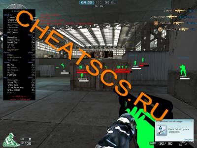 ![]() Меню чита запускается на INSERT. Клавиши активации в меню чита UP уникальный чит wh для crossfire чит делает стены при игре прозрачные структуры и стены так же в чите возможно смотреть сквозь стены в crossfire, обводит игроков зелёным цветом, над игроками показывает имена, показывает полосочку hp. |