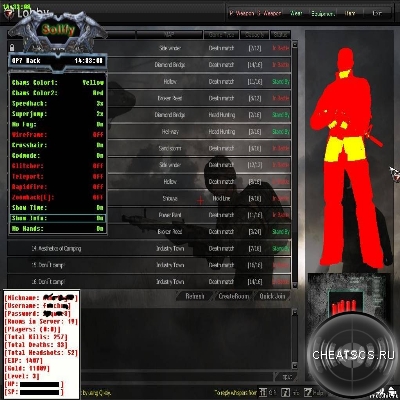 ![]() Функции: Color Chams (8 Colors) Speedhack (1~10) Superjump (1~10) No Fog Wireframe Crosshair Godmode Glitcher Teleport Rapidfire Zoomhack Show Time Show Info No Hands |